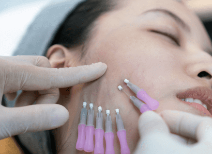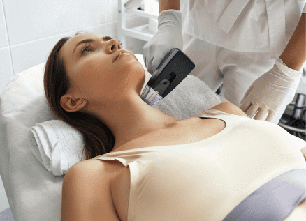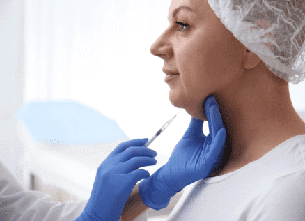 Introdução de ativos lipolíticos por meio de uma pequena agulha para a redução da gordura na região da papada.